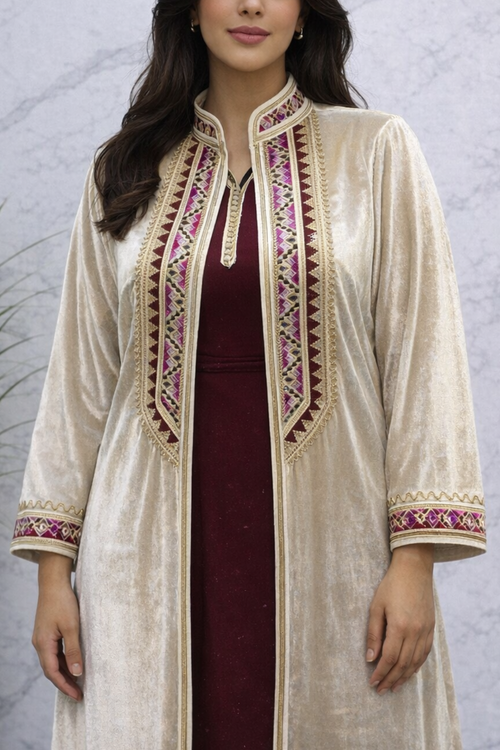 - Ce vêtement traditionnel maghrébin se distingue par sa teinte douce et apaisante.